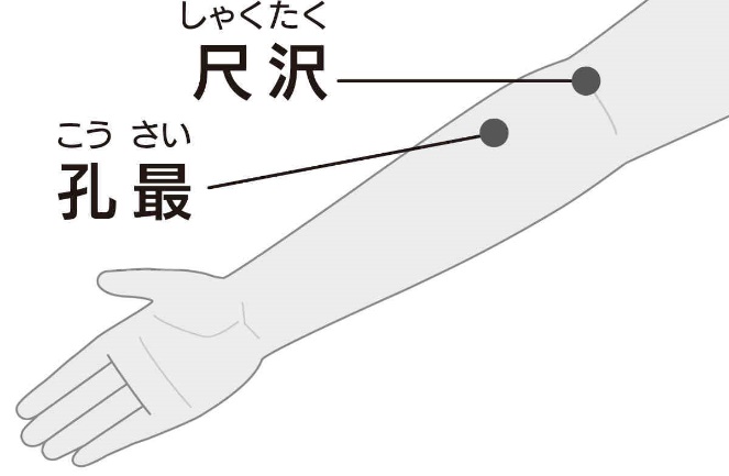 孔最(こうさい):肘を曲げた横じわから、手首の方へ指幅4本のところで親指側。急な咳、喉の腫れや痛みの緩和に。