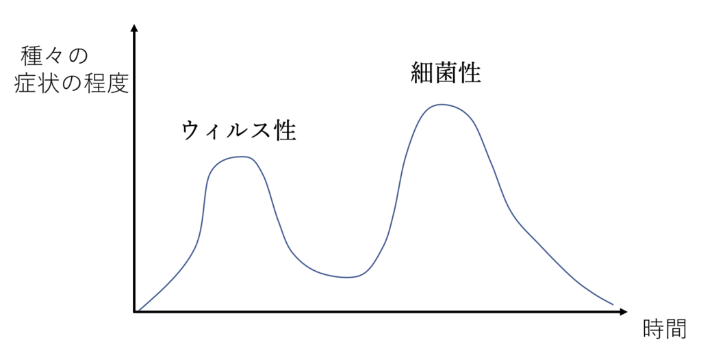 ② 風邪(咽頭痛、鼻症状、咳など)が軽快したあとに、咳・発熱が再燃(二峰性の経過)(図1)。例えば、喉の痛みと37度程の微熱があり、3日くらいで軽快してきたが、その後数日してから38度台の発熱と咳が出現した