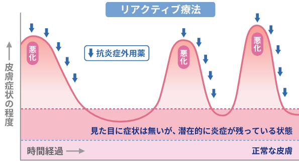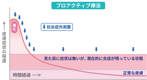 炎症部位にステロイドを数日~7日ほど塗布して炎症がおさまった後、ステロイドを定期的に(週2~3回)塗ることを続けて、炎症の再発(さいはつ)を予防します。